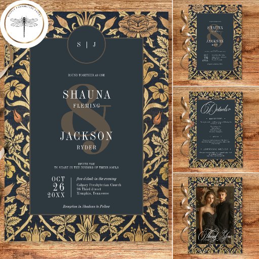 Incêndio no encantamento do passado com nossos convites de casamento floral vintage. Inspirados pelos icônicos designs de William Morris, estes convites apresentam uma mistura mesmerante de matizes vintages - negros moderados, vermelhos úmidos, bronzeados suaves, dourados e cremes. Os intrincados padrões florais, reminiscentes da era Art Nouveau, exudem um toque de escuridão, acrescentando um misterioso fascínio ao seu dia especial. A área de texto negro do carvão, adornada com fontes elegantes, fornece um contraste impressionante contra o cenário rico da tapeçaria. Este design de eterno captura a essência do romance clássico, fazer-o a escolha perfeita para casais que buscam um convite verdadeiramente único e inesquecível. Criado pela imprensa simplesmente de farmácia.