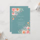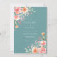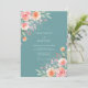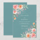 Um delicado arranjo de aquarela de flores de pêssego e blush com folhagem verde suave adorna este fundo azul-turquesa. O estilo pictórico evoca uma atmosfera romântica e arejada, perfeita para uma ocasião caprichosa e elegante.