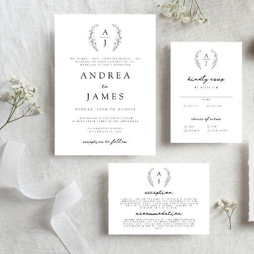 Um convite de casamento formal e minimalista, mas simples e elegante, que apresenta uma crista monográfica do nome da noiva e do noivo e uma combinação de sans serif e letra de caligrafia de script.