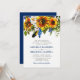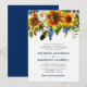 Convites de casamento boho de aguarela em azul naval e amarelo com um fundo branco clássico que pode ser alterado para qualquer cor, uma exposição floral de girassol rústico, penas e um modelo de convite de casamento elegante.