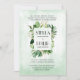 Folhas verdes tropicais modernas e elegantes ao redor de seus nomes em um quadro retangular com uma camada aqua de aqua coloração esplêndida atrás e ao contrário. Uma combinação de caligrafia ousada combinada com um layout de texto minimalista e contemporâneo faz dele um pacote de casamento de estilo de tendência. Este convite de casamento tropical selvagem é perfeito para um casamento de praia ou destino. Adicione o nome dos seus pais e os detalhes do casamento usando o modelo
