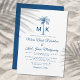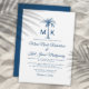 Convide seus hóspedes para ajudá-lo a celebrar seu dia especial com este convite elegante que inclui a tipografia moderna da escrita, suas iniciais e uma palmeira artística. Um fundo azul sólido de coordenação está na parte traseira da placa. Perfeito para uma praia ou um local de casamento ao ar livre.
