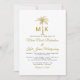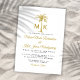 Convide seus hóspedes para ajudá-lo a celebrar seu dia especial com este elegante convite a ouro, preto e branco, com tipografia moderna, suas iniciais e uma palmeira artística. Perfeito para uma praia ou um local de casamento ao ar livre.