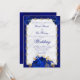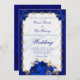 Aproveite o luxo a um preço de barato com este elegante convite de casamento floral azul real. Um fundo metálico azul, uma placa branca e uma estrutura de joias de filigrana dourada combinam-se com rosas azuis ricos para a elegante design de casamento. O texto azul em fontes formais clássicas pode ser facilmente personalizado para seu próprio dia especial. No verso está um monograma decorativo em cores complementares.