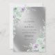 Este design apresenta um fundo metálico prateado brilhante que cria um clima sofisticado e luminoso. Rosas suaves em tons de lavanda e lilás em aquarela são combinadas com folhagens delicadas em verde-sage. Os elementos botânicos etéreos oferecem uma estética graciosa e romântica perfeita para um evento formal de inverno ou primavera.