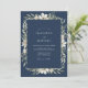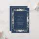 O azul marinho profundo fornece um pano de fundo sofisticado para este design, que apresenta um arranjo delicado de anemones brancas e folhas de sage verde. O contraste nítido das flores em aquarela cria uma estética serena e atemporal. Esta obra de arte botânica oferece um visual clássico e refinado adequado para um evento formal de inverno.