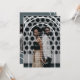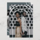 Este moderno convite para o casamento mostra uma foto de sangria de cheio na frente com uma cobertura de tipografia arquivada. O dorso é um impressão geométrico bonito, azul e branco, com uma fotografia em forma de arco.
