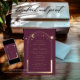 Mística Plum Sun Moon Dourado Stars Astronomy Space Foto Inviting Exibe sol, lua e estrelas com uma estrutura dourada sobre fundo de ameixa. Dentro é a sua informação de convite de casamento. Personalize editando o texto nas caixas de texto e adicionando sua foto favorita. Projetado para você por ©Evco Studio www.zazzle.com/store/evcostudio