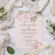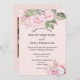 Fontes atuais e modernas quase roubam a luz do calado dos elegantes arranjos de rosas cor-de-rosa macia melhorados com embelezamentos de verde e ouro rosa que decoram o canto superior e inferior deste convite para casamento rosa e lúcido. O texto é o novo tradicional: "junto com suas famílias", em que a noiva e o noivo estendem o convite. O fundo é um pálido ligeiramente rosado, frontal e traseiro, e o texto é preto. A parte traseira da placa oferece um espaço para a foto do casal, enquadrada em cor-de-rosa escuro profundo e com os nomes do casal abaixo, ou exclui a área fotográfica para uma parte traseira da placa que é um rosa bonito. É simples trocar suas informações por nossos marcadores; basta clicar no link personalizar para começar.