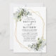 O Cartão de Convite para Casamento de Cores Biológicas Elegantes Modernos inclui folhas de eucalipto, folhagem botânica verde, folhas azuis empoeiradas e outros belos lençóis botânicos. Dourado Quadro Geométrico, Foto De Volta.