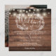 Um convite de casamento rústico com luzes bonito de cordas e uma delicada garland floral rústica desenhada à mão de folhagem botânica com tipografia de na moda, sobre um fundo de madeira rústica com sua foto especial no verso. Projetado por Thisnotme©