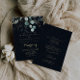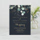 Este convite de casamento floral azul de ouro eucalipto é perfeito para um casamento rústico. Este design artístico apresenta folhagem verde de ouro, feita à mão, e cor d'água, eucalipto, em um fundo azul escuro, inspiradora beleza natural. Salve o papel, incluindo mais detalhes na parte traseira do convite em vez de em uma placa de gabinete separada.