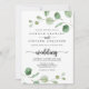Este susto eucalipto de frente e de trás é perfeito para um casamento simples. A design apresenta galhos e folhas botânicas elegantes e desenhadas a aquarela e desenhadas à mão. Salve o papel, incluindo mais detalhes na parte traseira do convite em vez de em uma placa de gabinete separada.