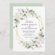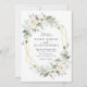 Um design verde de casamento com flores brancas pintadas a aquarelas, um quadro geométrico e verde. Um design perfeito para o seu casamento de verão e primavera. Você pode personalizar o texto e os detalhes de cor neste modelo de convite de casamento.