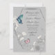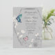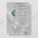 Este convite de casamento floral geométrico contém duas belas borboletas, um azul dramático e um rosa bonito. Eles estão empoleirados em um arranjo de flores elegante que está lindamente entrelaçado com um hexágono artístico de cinza escura. Este convite é feito em tons de cinza, bege, azul e rosa.