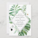 Convite de casamento da floresta Trendy com folhas verdes de praia tropical entrelaçadas em um quadro geométrico de cinza.