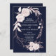 Design de Casamento Geométrico das Flores Brancas Douradas Elegantes Rosa. Apresenta elegantes flores brancas rosa douradas, quadro geométrico rosa dourado, divisor floral dourado rosa no verso, tudo sobre fundo azul escuro. Use a ferramenta Personalizar para adicionar suas informações, alterar a cor de fundo. Para obter itens correspondentes, visite minha Coleção de Flores Brancas Douradas Rosa.