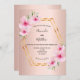 Um convite para o casamento tropical de verão elegante. Com uma falsa estrutura geométrica de ouro decorada com hibisco de rosas claro, flores tropicais com um pouco de verde. Um fundo metálico falso rosa dourado. Os primeiros nomes da noiva e do noivo são escritos com um moderno roteiro de estilo. Texto preto. Fundo: fundo metálico rosa dourado de fau.