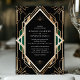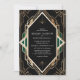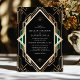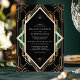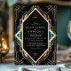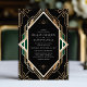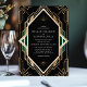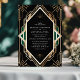 Ponha o tom para uma celebração elegante com este maravilhoso convite ao casamento Art Deco, apresentando um intrincado padrão geométrico de ouro num fundo negro rico com sotaques verdes esmeraldas. O sofisticado charme design e vintage o tornam ideal para um casamento com um toque de glamour 1920. Perfeito para casais que apreciam o estilo do eterno e o luxo, este convite capta a essência da era Art Deco.