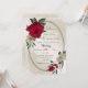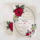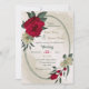 Convite de casamento único com flores românticas vermelhas e amarelas pálidas e folhas verdes em uma bela estrutura geométrica oval. PARA MAIS PRODUTOS CORRESPONDENTES, clique na coleção acima ou entre em contato comigo.