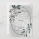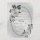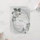 Convite de casamento único com flores brancas românticas e folhas verdes em uma bela estrutura geométrica oval. PARA MAIS PRODUTOS CORRESPONDENTES, clique na coleção acima ou entre em contato comigo.