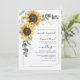 Geométrico Venerado Girassol modelo de Convite para Casamento de Girassol que você pode personalizar facilmente clicando no botão "Personalizar". Apresentando Eucalyptus verde e girassol floral com geometria de fundo branco