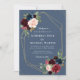 Uma design de casamento Floral com uma estrutura geométrica dourada com texto no meio. As flores azul-marinho e burgundy de aquarela são perfeitas para o casamento rústico do outono e para os temas do casamento floral do inverno. Você pode mudar as cores azuis e arrojadas, juntamente com o texto, tamanho do texto e fonte neste modelo de convite de casamento.