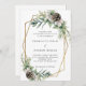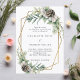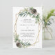 Para um casamento no inverno. Um fundo branco decorado com cones, bagas brancas e verde. Um quadro geométrico dourado. Personalize e adicione seus nomes e detalhes.