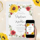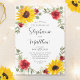 Estes elegantes convites para o casamento apresentam um design de girassol a cores-d'água com rosas vermelhas, flores do hálito do bebê branco, folhas de eucalipto e uma falsa borda geométrica de ouro sobre fundo branco. Os nomes da noiva e noiva estão em uma fonte moderna de caligrafia. Personalize-os com o seu texto. Produtos correspondentes disponíveis.