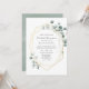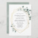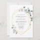 Trendy watercolor eucalipto, convite para casamento de prata de prata com moldura geométrica dourada e coloração d'água prateada inversa.