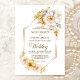 Convide seus amigos e entes queridos para o seu casamento para testemunhar e celebrar o início de sua jornada ao longo da vida com este elegante convite de casamento geométrico floral branco e ouro. O texto personalizável permite adicionar sem esforço os nomes da noiva e do noivo, a data do casamento e os detalhes necessários de sua celebração. Uma variedade de tipos de papel e estilos de canto estão disponíveis para seus convites exclusivos, juntamente com a opção de download se você preferir um formato digital.