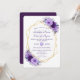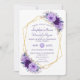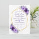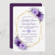 Casamento Geométrico Dourado com Roxo de Diamante. Design de cartão moderno e elegante, com dois diamantes duplos de folha de ouro falsos, dois buquês florais roxos, sobre fundo branco. Um fundo roxo atrás. Use a ferramenta Personalizar para adicionar suas informações. Para itens correspondentes, visite minha Coleção Geométrica Floral Dourada de Diamond Purple.