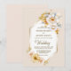 Convide seus amigos e entes queridos para o seu casamento para testemunhar e celebrar o início de sua jornada ao longo da vida com este convite de casamento geométrico floral de na moda branco e ouro. O texto personalizável permite adicionar sem esforço os nomes da noiva e do noivo, a data do casamento e os detalhes necessários de sua celebração. Uma variedade de tipos de papel e estilos de canto estão disponíveis para seus convites exclusivos, juntamente com a opção de download se você preferir um formato digital.