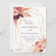 Este convite para o casamento apresenta flores rústicas a cores aquáticas em terracotta, burgundy, laranja queimada, amarela, esbranquiçada com grama bege e pampas marrom, e um quadro geométrico dourado. Para personalização mais avançada deste design, clique no link "personalizar mais". Itens correspondentes também estão disponíveis.