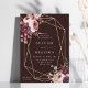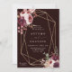 Este convite para o casamento inclui buquês de flores de aquarela de dália, rosa de jardim, peônia, capim de pampas, e hydrangea em vermelho-burgundy, terracotta, cor-de-rosa-pincelada sobre folhas de outono com uma falso estrutura geométrica de ouro. Para uma personalização mais avançada deste design, clique no BOTÃO FERRAMENTA DESIGN AZUL. Itens correspondentes também estão disponíveis.
