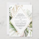Este convite de casamento para diamantes tropicais de ouro geométrico é perfeito para um casamento de destino. O design apresenta ouro de aquarela pintada à mão e palmeiras verdes e folhas de bananeiras com flores cor-de-rosa amontoadas em buquês, enfeitando um quadro geométrico.