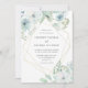 Os convites para casamento Elegante de cor aquática verde apresentam flores brancas e folhagem botânica que decoram o fundo com um centro de molduras geométricas de ouro moderno. use as ferramentas online de modelo para personalizar este convite único para o seu dia especial.