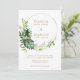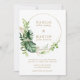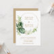 Um convite de casamento botânico moderno com seus nomes dentro de um círculo geométrico cercado por uma aquarela pintada de verde tropical e folhas de ouro falsas. Seus detalhes e fundos estão em um tom dourado correspondente. Estes convites elegantes são perfeitos para um casamento de destino de verão numa área tropical.