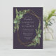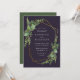 Convite de casamento Chic verão com vegetação botânica de aquarela e estrutura geométrica falsa de ouro com na moda e tipografia moderna mostrando seus detalhes contra um fundo roxo escuro. Esse convite se reverte para um fundo verde-escuro com delicado padrão botânico.