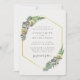 Suculentos são a escolha perfeita para um casamento! Este convite de casamento com plantas suculentas e coroa em forma de hexágono transmite um tom simples, mas elegante para seus convidados de casamento. A mistura de ouro e tons verdes é uma escolha bela e moderna para qualquer celebração de casamento.