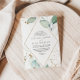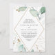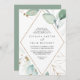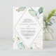 Este convite de casamento de ouro geométrico de eucalipto em diamante é perfeito para um casamento rústico. Este design artístico apresenta ouro aquoso desenhado à mão e folhagem verde enfeitando uma armação geométrica, inspirando beleza natural.
