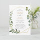 Este elegante e personalizável Convite de Casamento apresenta um quadro de ouro geométrico adornado com uma bela folhagem verde de aquarela e foi emparelhado com uma caligrafia balística e uma serifa clássica em ouro e cinza. Para fazer alterações avançadas, selecione a opção "Clique para personalizar mais" em Personalizar este modelo.