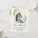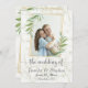 Dourada estrutura geométrica embelezada com folhas verdes de cor d'água eucalipto ao redor da foto na frente, faz um anúncio elegante para seu próximo casamento. Os detalhes importantes no verso também se enquadram com ouro e folhas de eucalipto.