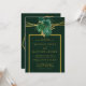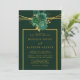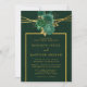 Design apresenta um elemento floral colorido impresso em tons de esmeralda verde e ouro. Texturas de canvas verde com falso quadro geométrico em ouro e florações de pedras com script de caligrafia em ouro ou escrevendo de tipo. Excelente para as comemorações do casamento!