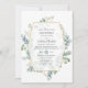 Convite de casamento herbário de eucalipto florestal selvagem com estrutura geométrica dourada concebida para ser rápida e facilmente personalizada de acordo com as especificações do seu evento.