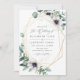 Trendy geométrico eucalipto verde e flores de papoila em tons de pastel convite para casamento com moldura geométrica dourada e lavagem de cor d'água de menta inversa.