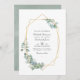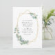 O convite para fotos de casamento do eucalipto verde da floresta com o quadro geométrico dourado e a aquarela prateada são personalizáveis de acordo com as especificações do seu evento. Ideal para qualquer tema ou casamento de jardim. O código QR no verso direciona para o seu local de casamento onde o pessoas pode aprender mais e rsvp.