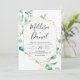 Convite de casamento com folhas de cor verde-d'água pintada à mão, eucaliptos, pintadas à mão, enfeitiçadas por uma estrutura geométrica de ouro branco moderna.