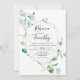 Este elegante Convite de Casamento apresenta um quadro geométrico dourado branco adornado por folhas de eucalipto de cor verde-menta pintadas à mão e por foi emparelhado com uma escrita caprichosa e uma fonte serif limpa. Para alterações avançadas masculinas, selecione a opção "Clique para personalizar mais" em Personalizar este modelo.