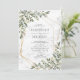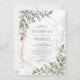 Crie o convite perfeito para o casamento com este design floral moderno, modesto e rústico, eucalipto cólico verde-aquarela, com uma falsa folha de ouro geométrica no mármore faux Carrera. Entre em contato com o designer para produtos correspondentes. Copyright Elegant Invites, todos os direitos reservados.